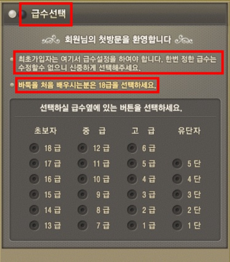 4️⃣ 급수를 선택합니다. 본인의 기력에 맞는 급수를 선택해야 하며,