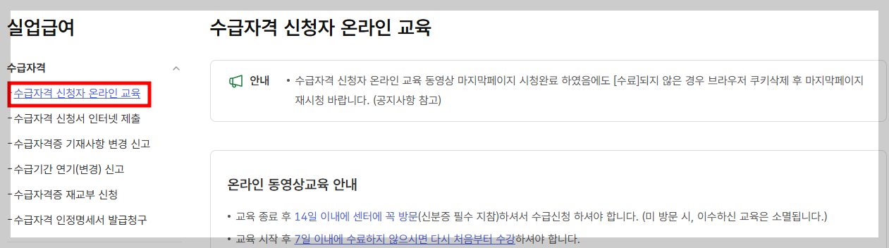 - 실업급여 > 수급자격 신청자 온라인 교육 메뉴를 클릭합니다.