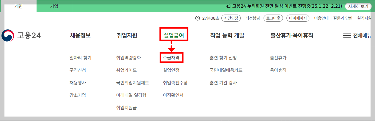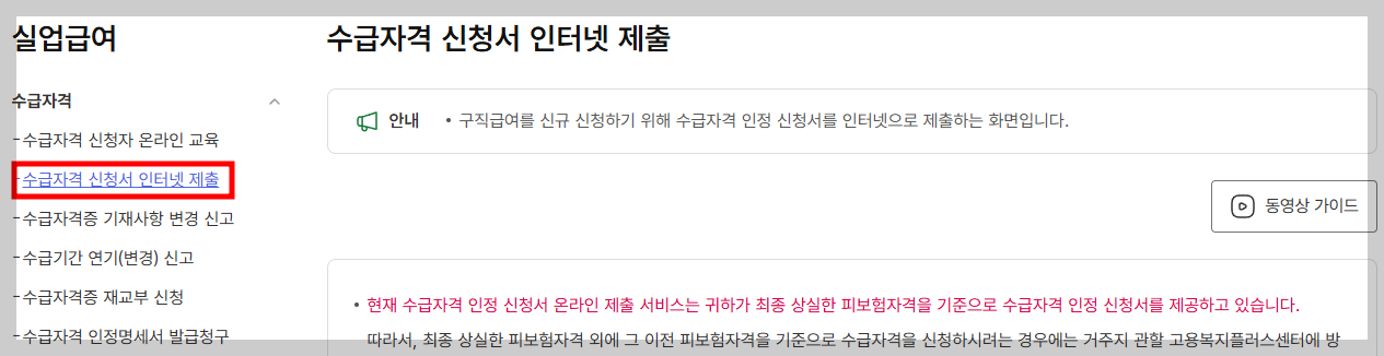 - 실업급여 > 수급 자격 신청 메뉴를 클릭합니다.
