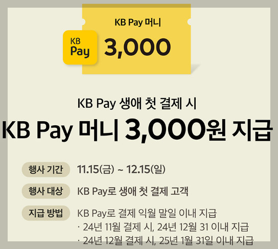 - KB Pay 생애 첫 결제 시 KB Pay 머니 3,000원 지급